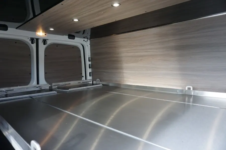 Dank einer zweiten Trennwand verbleibt zwischen Fahrerraum und Sargraum ein abgetrennter Stauraum. Dieser Raum dient als Staufläche und Transportmöglichkeit für Bestatterbedarf (z.B. Sargroller) oder Platz für ein Regalsystem für Urnentransporte. Rasterschienen dienen zur sicheren Verlastung des Ladeguts.