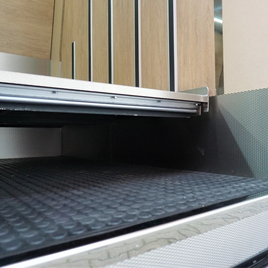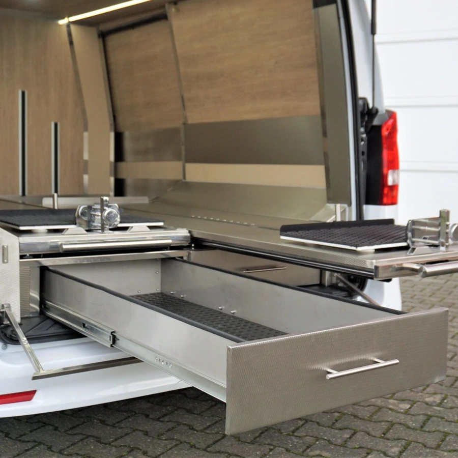 Seine einzeln fahrbaren Bahnen sowie die angenehme Beladehöhe ermöglichen ein komfortables und sicheres Handling im Alltag. Ergänzend schafft ein optionales 2er-Schubladenpaket Stauraum für Zubehör.