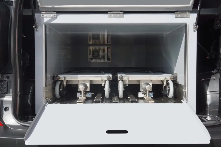 In einer speziellen Kompressor-Kühlkammer können bis zu zwei Verstorbene auf einem Roll-in-System zuverlässig und würdevoll transportiert werden. Besonders in wärmeren Ländern ist dieser Ausbau eine häufig gewählte Lösung für Überführungsfahrten.
