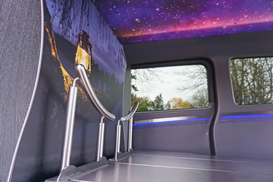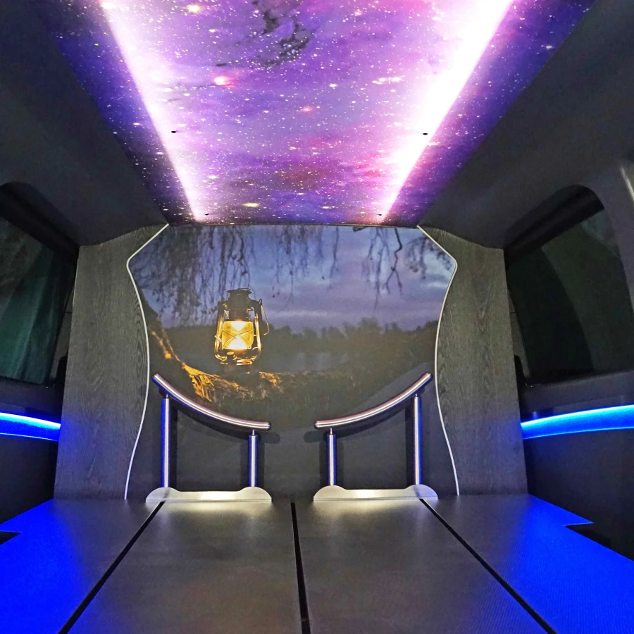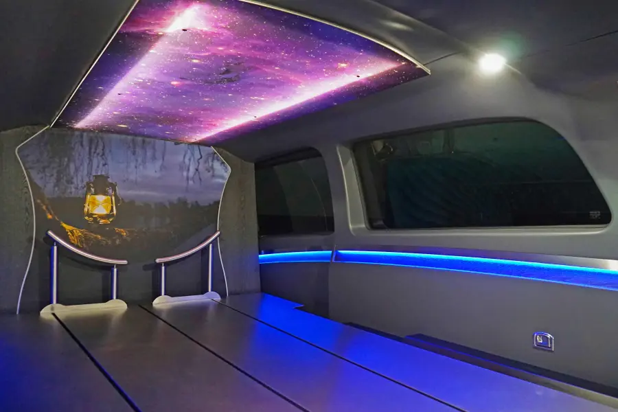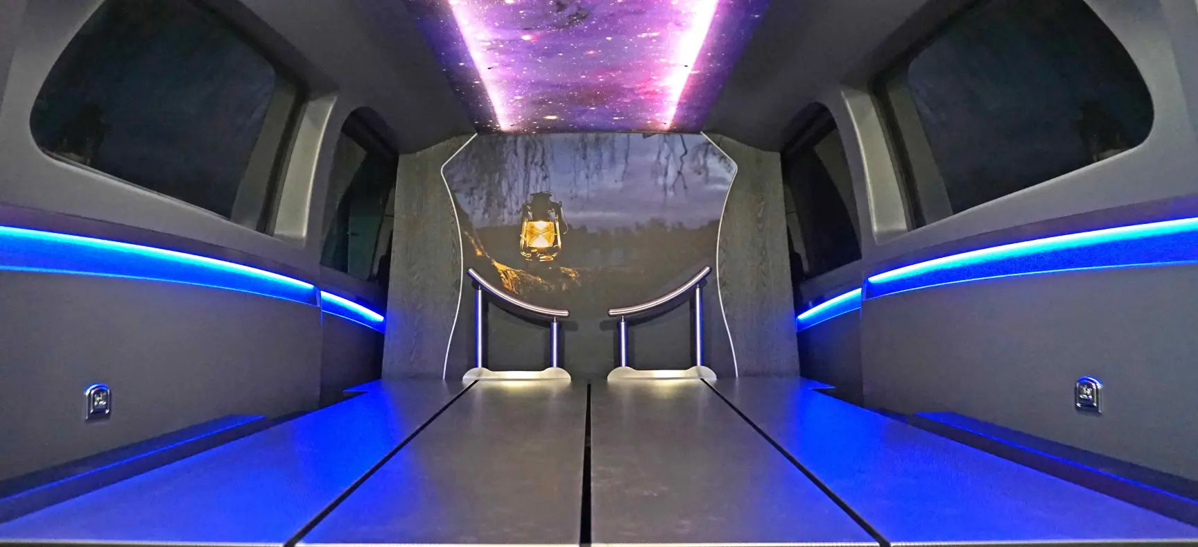 Durch strukturierte FVW-Verkleidungsteile und eine 3-teilige Trennwand aus Seriendekor eingefasst. Mit rundum Vorfeld- und Sargraumbeleuchtung ausgestattet.