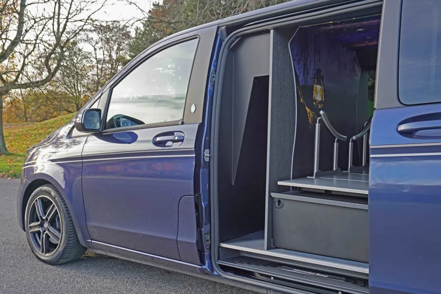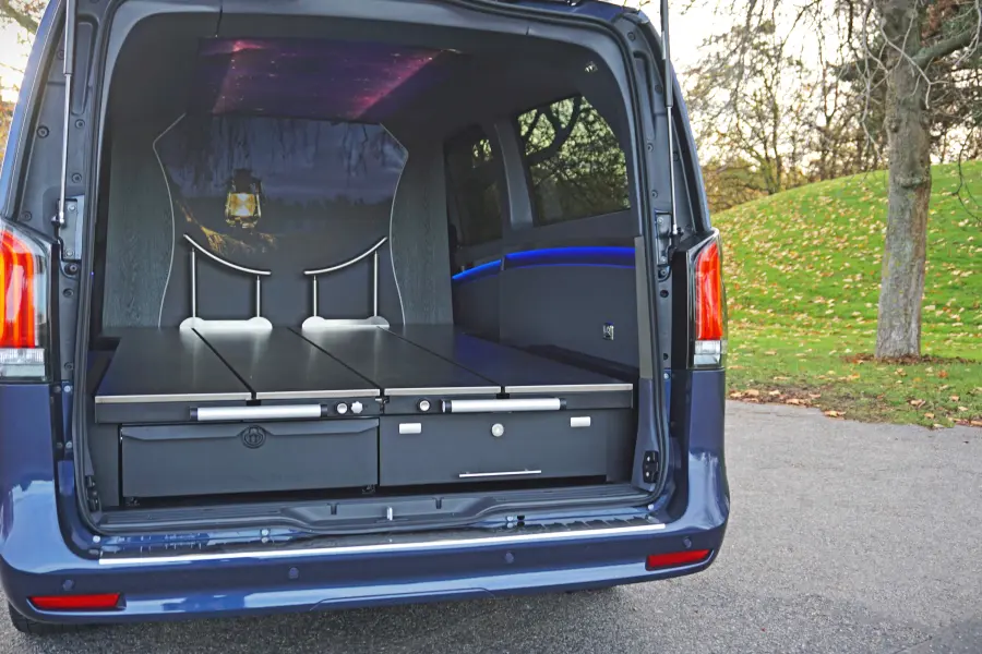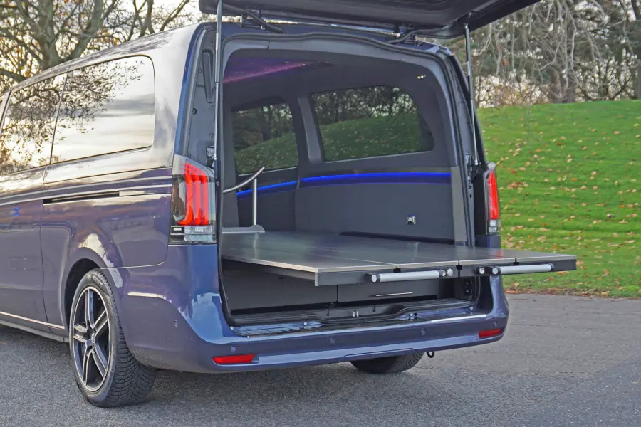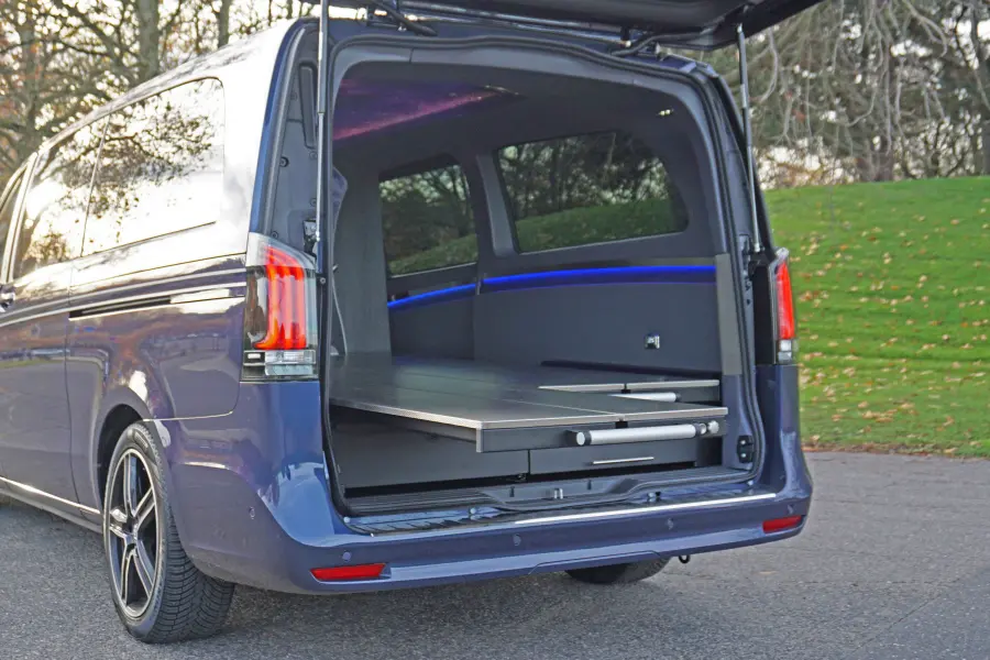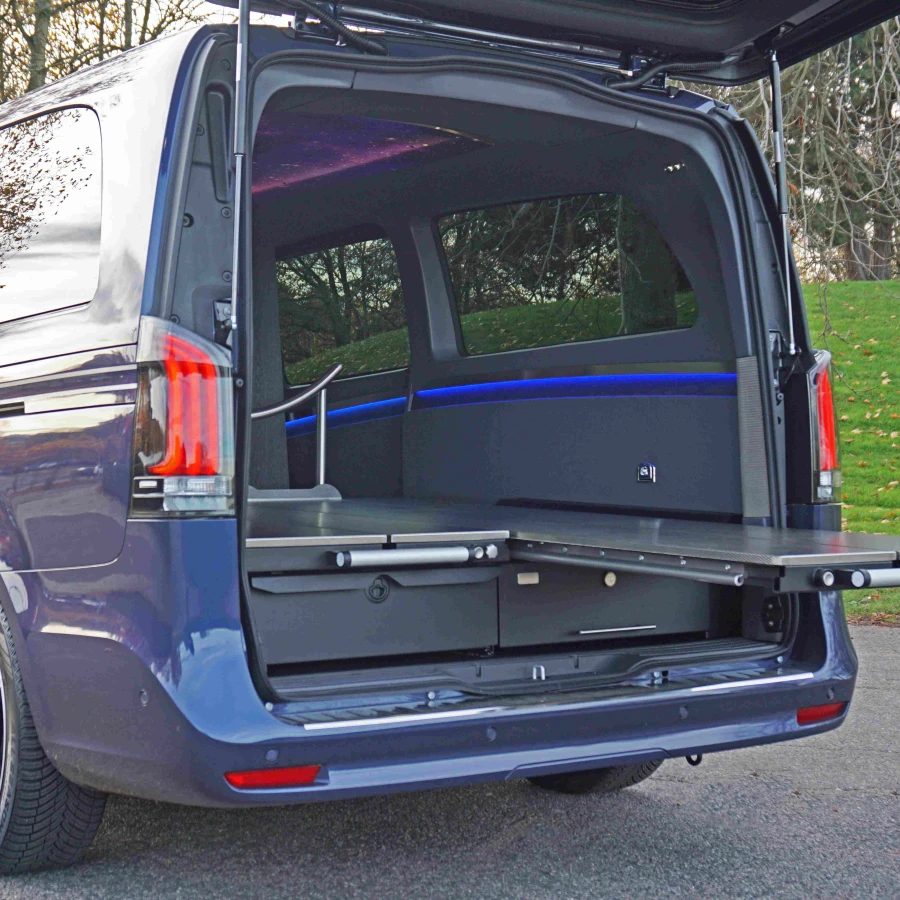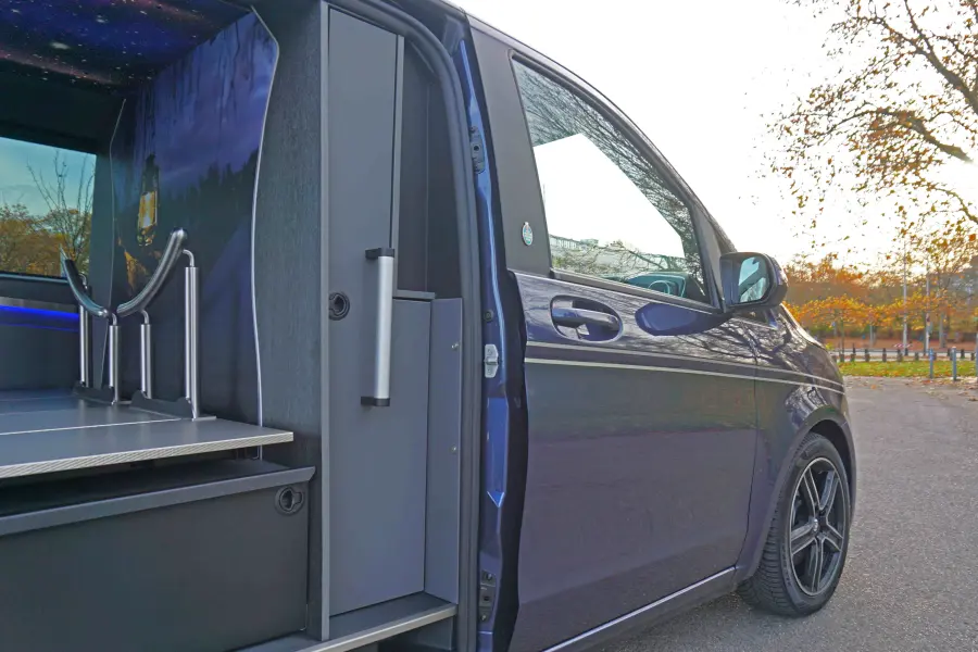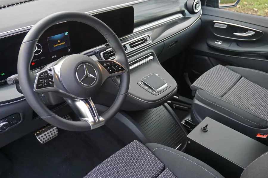 Maximaler Sitzkomfort auf dem Fahrersitz. Großer, beleuchteter und individuell konfigurierbarer Auszug auf der Beifahrerseite. Fach für den Sargroller auf der Fahrerseite.