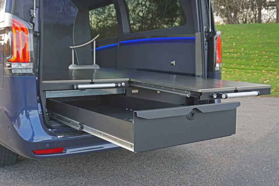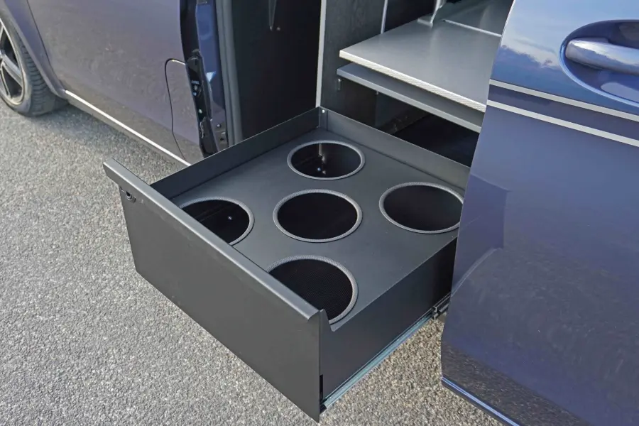 Eine geräumige Schublade auf der Beifahrerseite, welche über die Schiebetüre erreichbar ist.