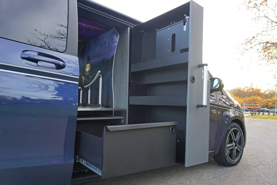 Eine geräumige Schublade auf der Fahrerseite mit Platz für 5 Urnenkapseln.