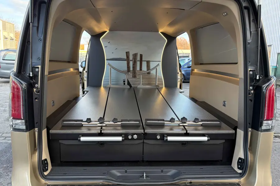 Umbau zum Bestattungswagen als 2-Sarg manuell, Trennwand mit Trennwandschrank, Lichtpaket, Acryl-Glas in Sonnen-Optik, Seitenwandverkleidung mit Designleisten, 2 Schubladen im Heck, Urnenhalterung, Sargrollerhalterung, Hygieneeinheit, Ladekantenschutz, u.v.m.